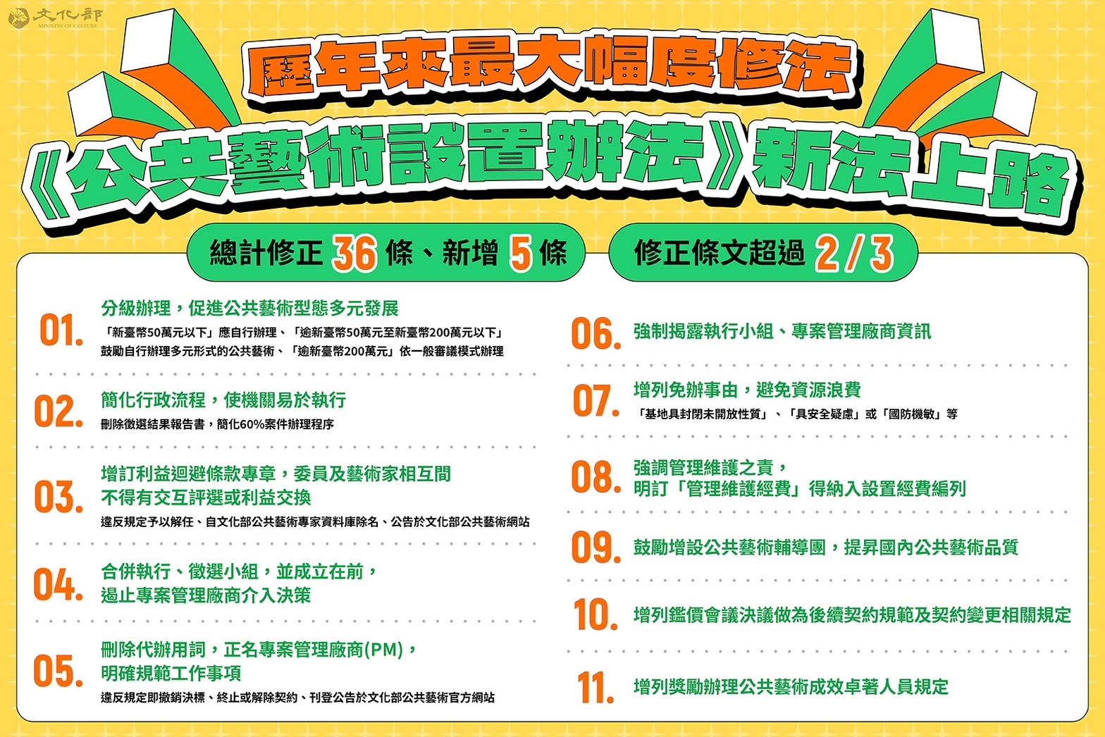 文化部表示,臺灣公共藝術制度執行已屆30餘年,至去年12月止共完成5,537件作品、投入2,000位以上藝術家及專家學者,歷年來累積相當豐富的執行經驗與成果。為落實新修正《公共藝術設置辦法》後續執行,文化部將針對興辦機關、審議機關、藝術家分批辦理講習及課程,也將與相關公協會合作,輔導藝術家進入公共藝術領域,期盼進一步完善公共藝術制度,提升公共藝術管理及執行效能,使全國公共藝術發展更加穩健與持續進步。