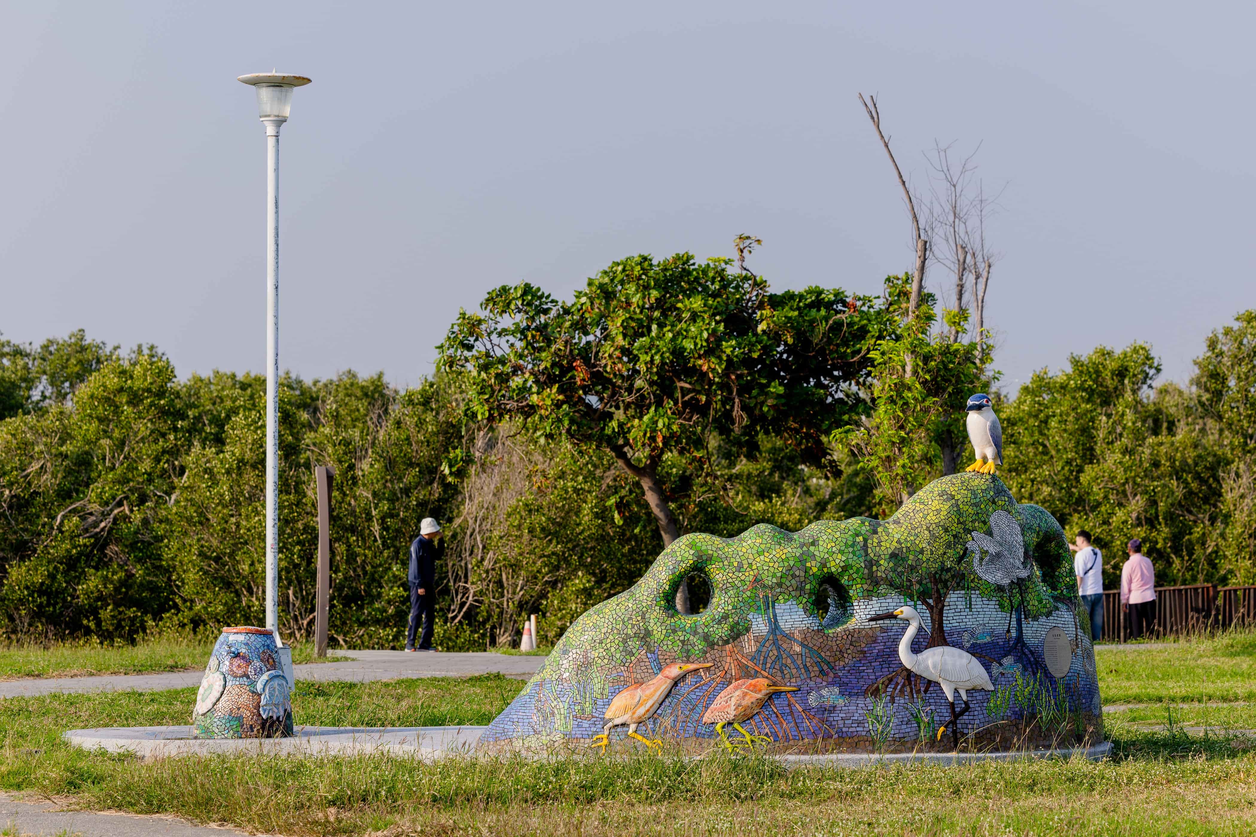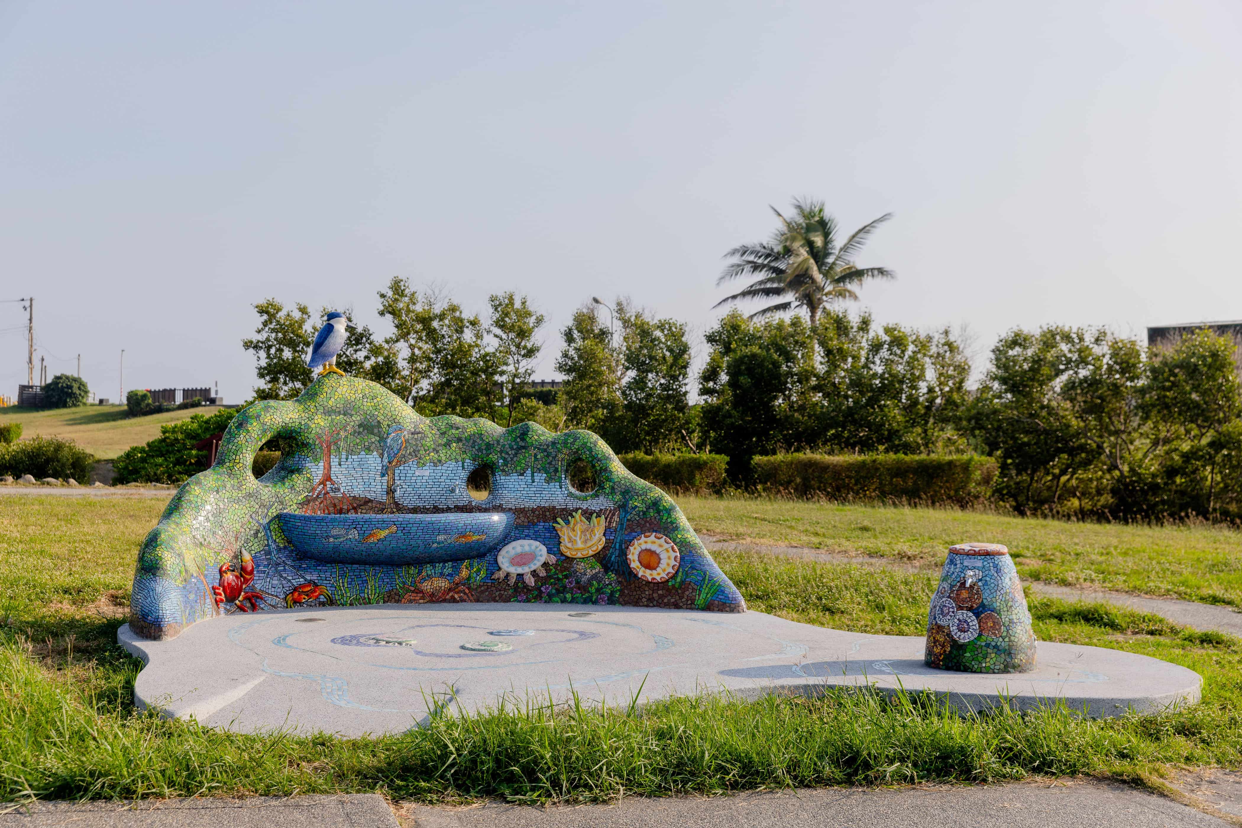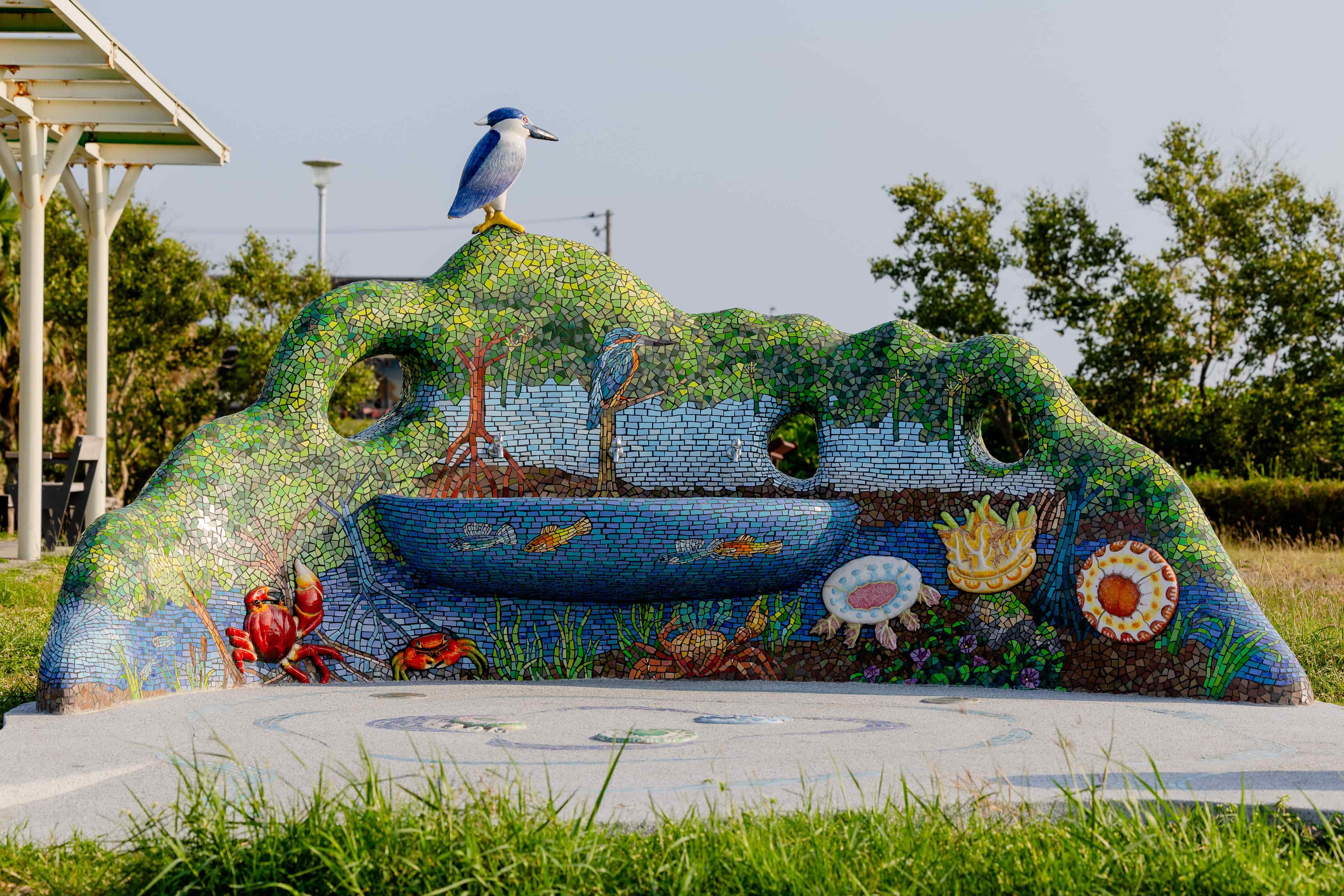 林園海洋濕地公園近日出現一座吸睛裝置藝術,為高雄在地藝術家李億勳以濕地公園豐富自然生態為靈感,創作的《生態禮讚》作品,作品以馬賽克磁磚及陶刻畫「仙后水母(又名倒立水母)」等在地生物,模樣栩栩如生,吸引公園內大人小孩駐足欣賞,作品結合洗手功能,兼具提升公園設施機能及打造濕地公園生態教育場域,為溼地公園注入一新亮點。