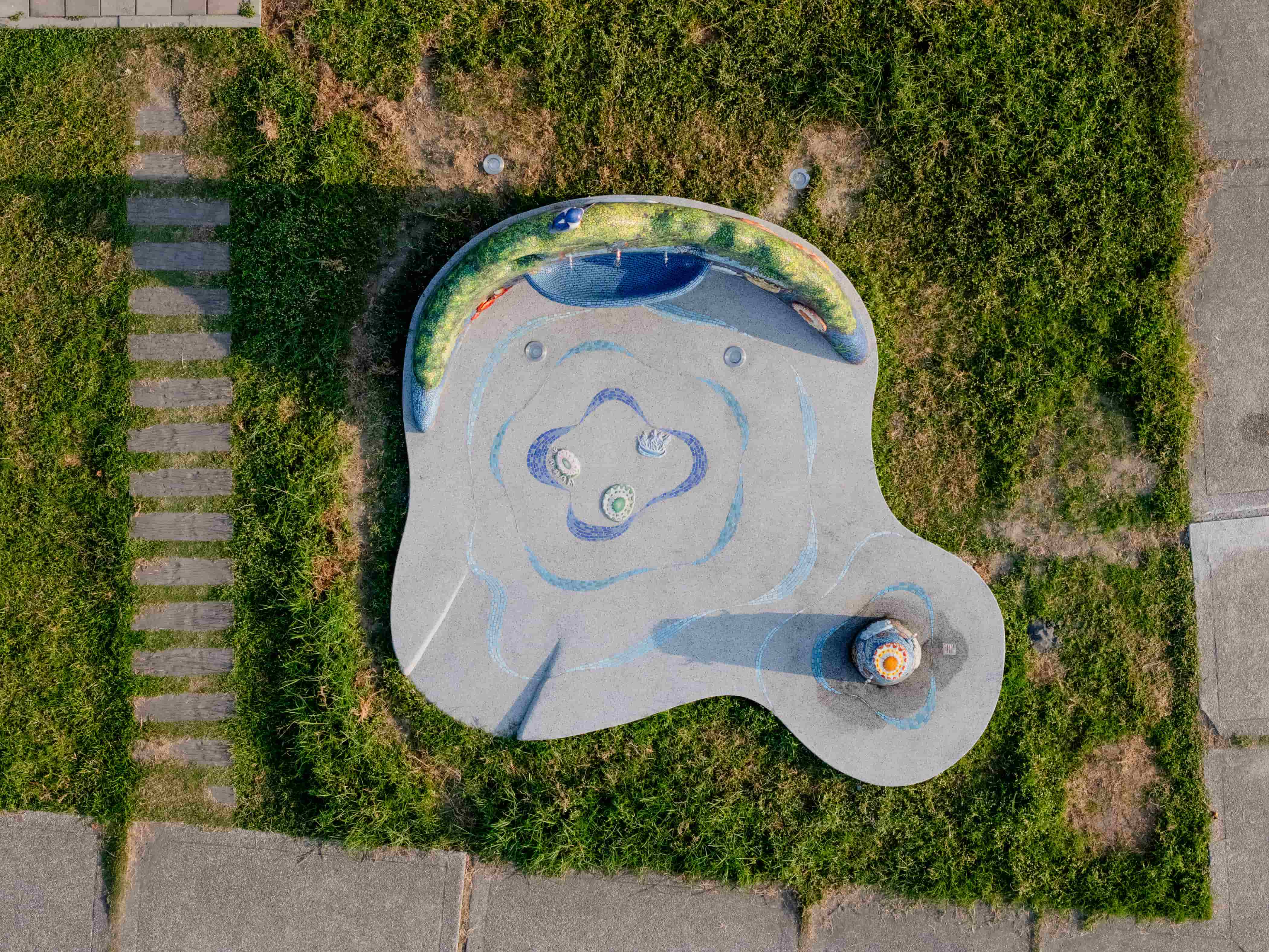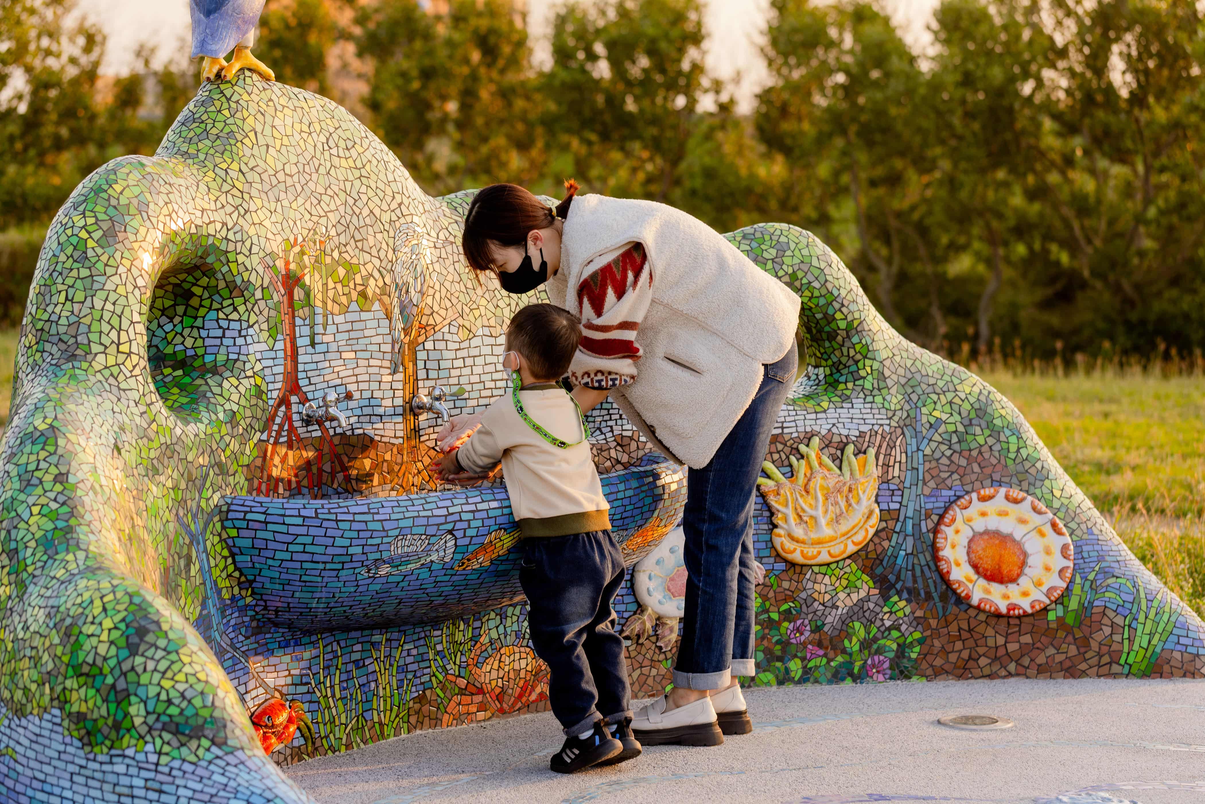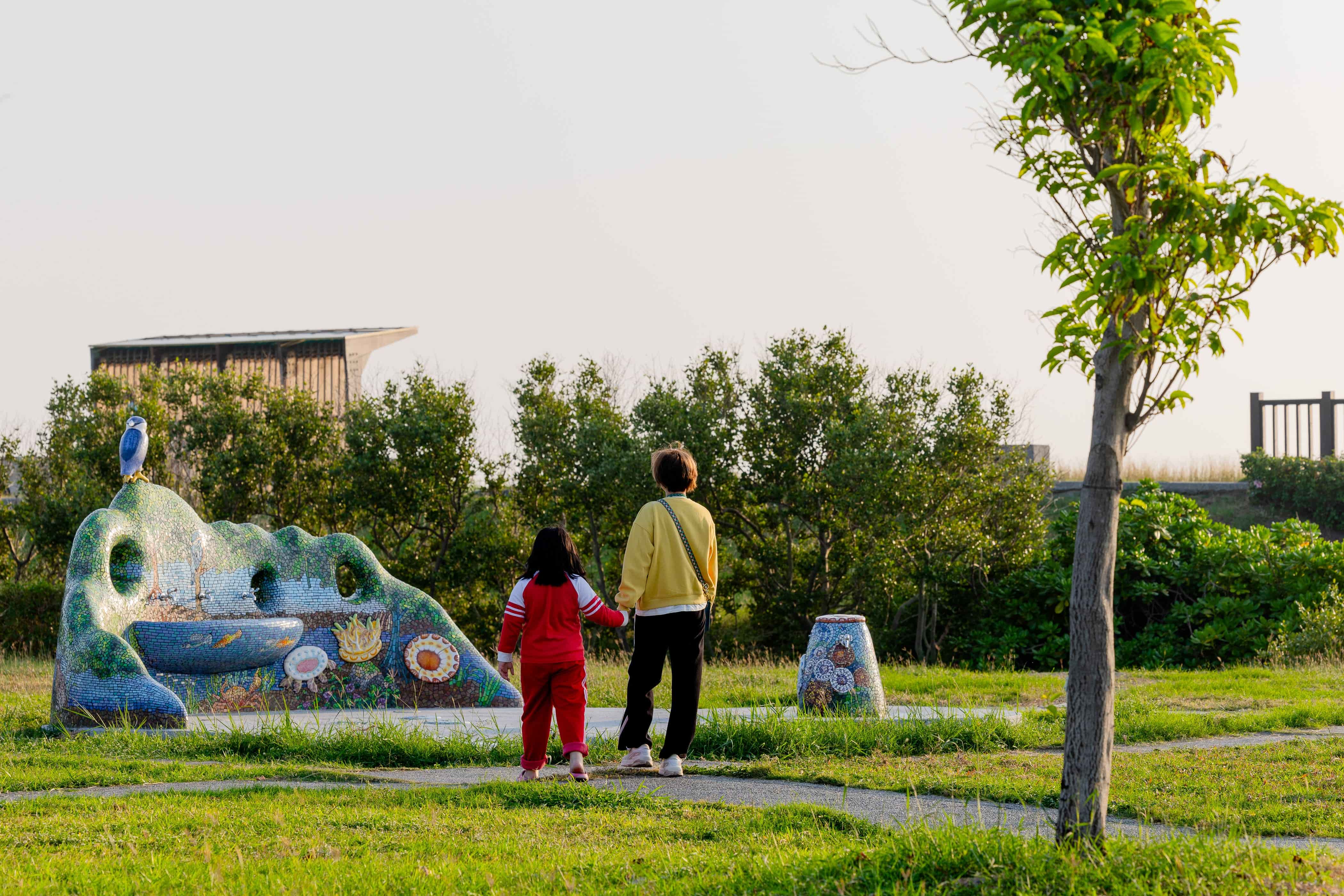 林園海洋濕地公園近日出現一座吸睛裝置藝術,為高雄在地藝術家李億勳以濕地公園豐富自然生態為靈感,創作的《生態禮讚》作品,作品以馬賽克磁磚及陶刻畫「仙后水母(又名倒立水母)」等在地生物,模樣栩栩如生,吸引公園內大人小孩駐足欣賞,作品結合洗手功能,兼具提升公園設施機能及打造濕地公園生態教育場域,為溼地公園注入一新亮點。